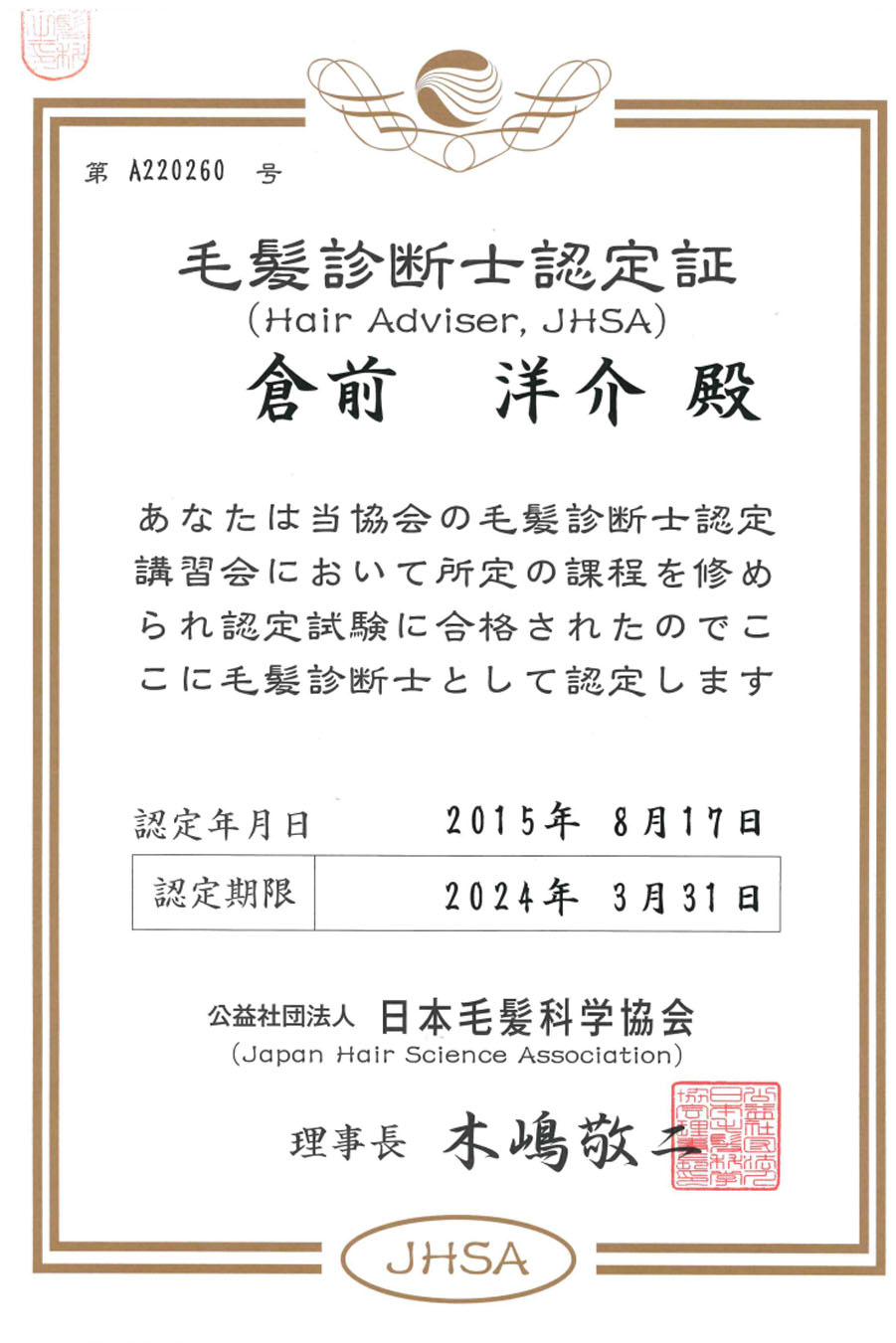 日本內閣府認定 日本毛髪科学協会毛髪診断士